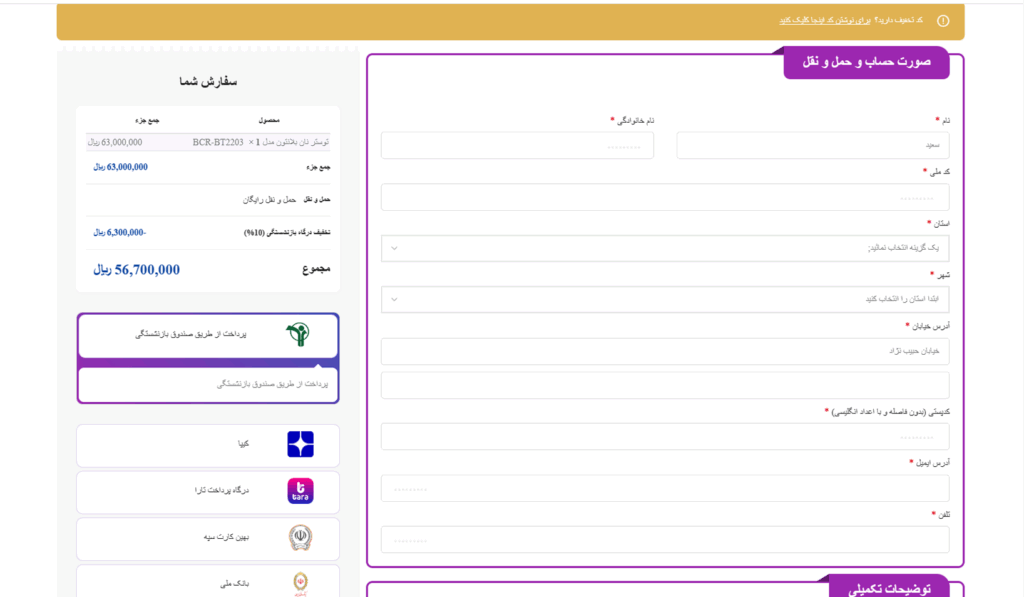 در صفحه تسویه حساب، ابتدا فرم «صورت حساب و حمل و نقل» را با اطلاعات خود تکمیل کنید.