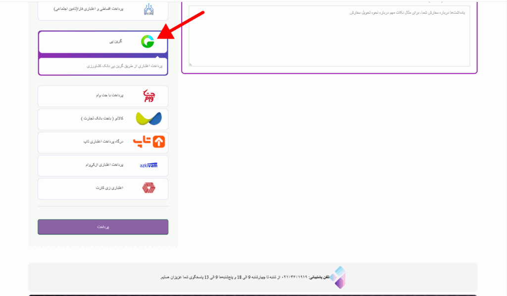 در پایین صفحه، از میان روشهای پرداخت، «گرینپی» را انتخاب کرده و دکمه «پرداخت» را بزنید.
