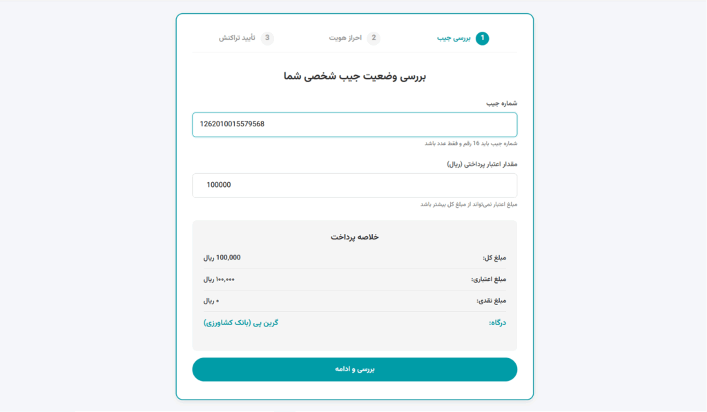 شما به صفحه پرداخت گرینپی هدایت میشوید. در مرحله اول، «شماره جیب» خود را وارد کرده و مبلغی را که تمایل دارید از اعتبار گرینپی خود پرداخت شود وارد کنید(توجه کنید که اگر مبلغ پرداختی با اعتبار گرینپی شما از مبلغ نهایی کالا کمتر باشد، برای پرداخت مابهالتفاوت مبالغ به درگاه پرداخت آنلاین هدایت میشوید) سپس دکمه «بررسی و ادامه» را بزنید.