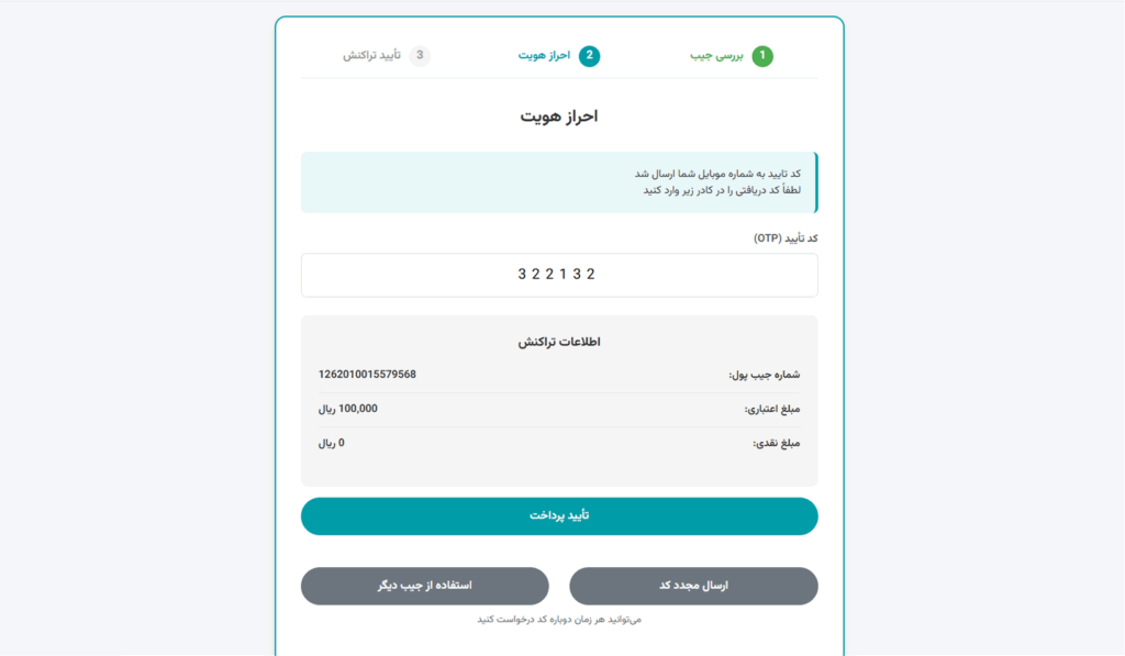 در مرحله دوم، «کد تایید (OTP)» که به شماره موبایل شما پیامک شده است را در کادر مربوطه وارد نمایید و دکمه «تایید پرداخت» را بزنید.