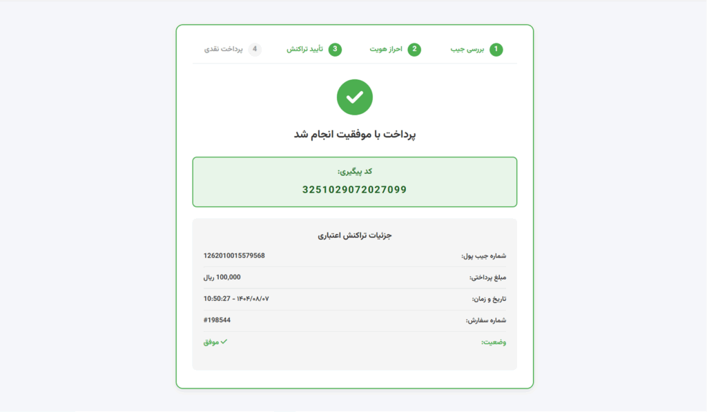 پس از تایید، پرداخت شما با موفقیت انجام شده و «کد پیگیری» به همراه جزئیات تراکنش به شما نمایش داده میشود.