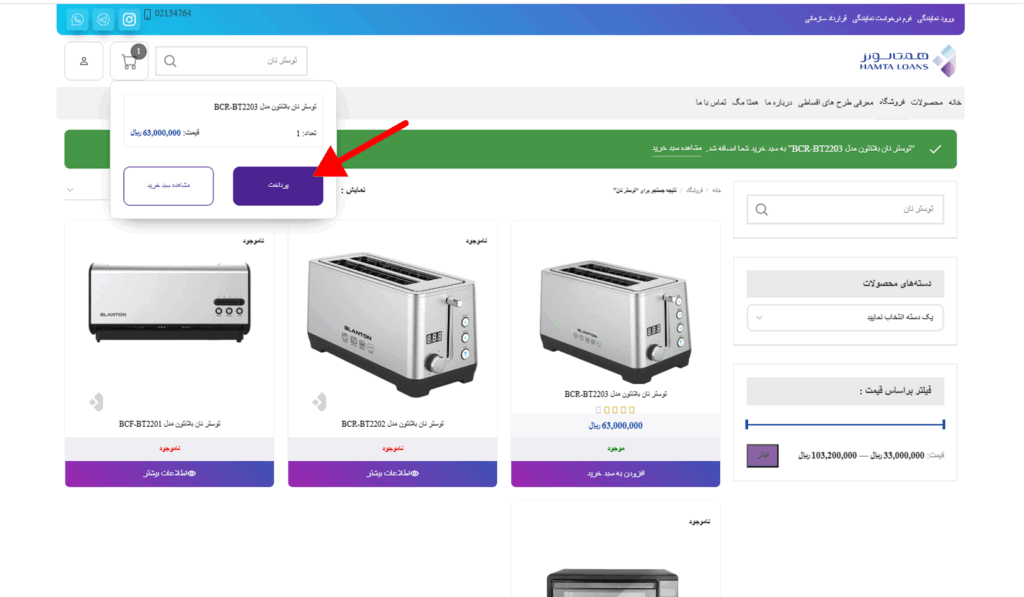 پس از انتخاب محصولات، با زدن دکمه «پرداخت» به صفحه تسویه حساب منتقل خواهید شد.